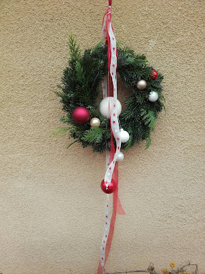 Ich hatte ja den kleinen Restekranz vom Adventskranzbinden in der Berufsschule noch nicht gezeigt - hier ist er, fertig dekoriert auf dem kleinen Regalbrett hinter dem Sofaeck.